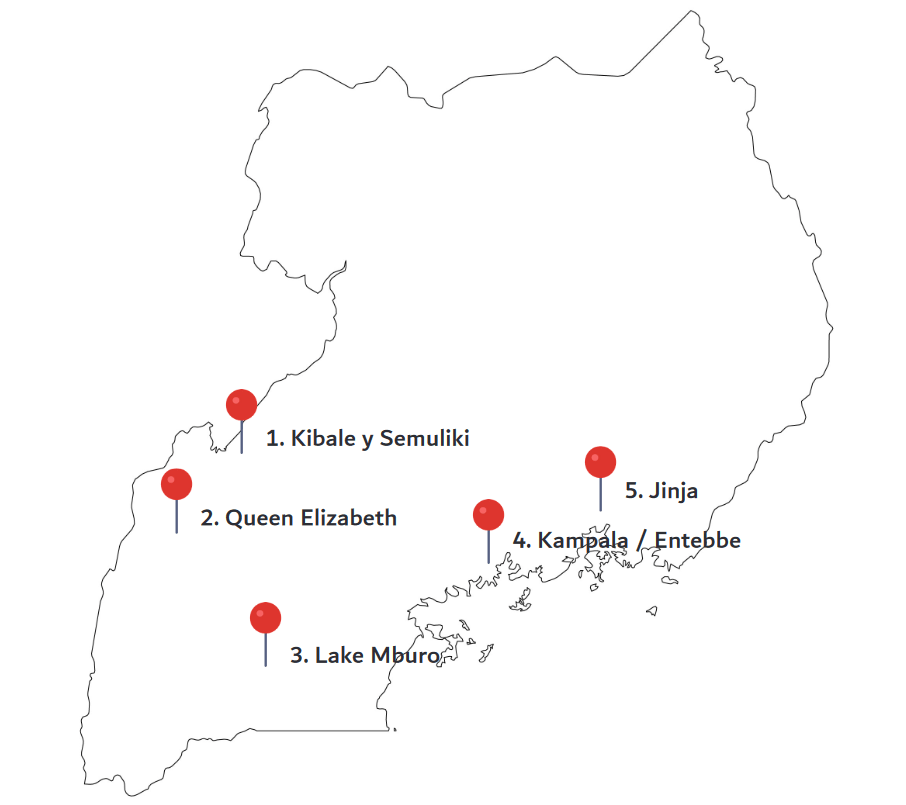 Ruta: Aeropuerto de Entebbe – Parque Nacional de Kibale – Parque Nacional de Semuliki – Parque Nacional de Queen Elizabeth – Parque Nacional de Lake Mburo – Kampala y Entebbe – Jinja – Aeropuerto de Entebbe