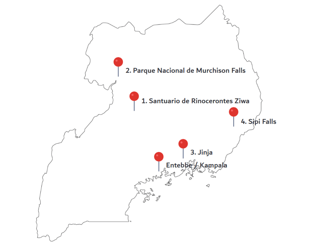 Ruta: Aeropuerto de Entebbe – Santuario de Rinocerontes de Ziwa – Parque Nacional de Murchison Falls – Jinja – Sipi Falls – Aeropuerto de Entebbe